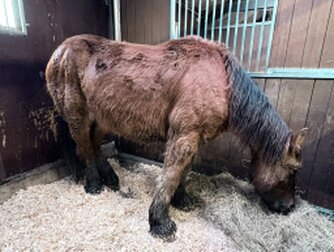La ponette présentait une démarche vacillante et souffrait d’une fourbure chronique, avec des pieds extrêmement longs. Elle peinait à se maintenir debout et subissait les assauts répétés du poney étalon, qui a même fini par la renverser.