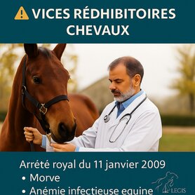 Dans les ventes entre particuliers pour les équidés, l’arrêté royal du 11 janvier 2009 limite expressément la notion de vice rédhibitoire à deux affections précises : la morve et l’anémie infectieuse équine