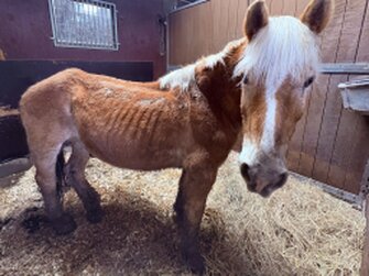L'hongre, hébergé au Refuge du Marais est dans un état inquiétant avec pronostic fortement réservé : extrêmement amaigri, stade avance de cachexie, peine à se déplacer.